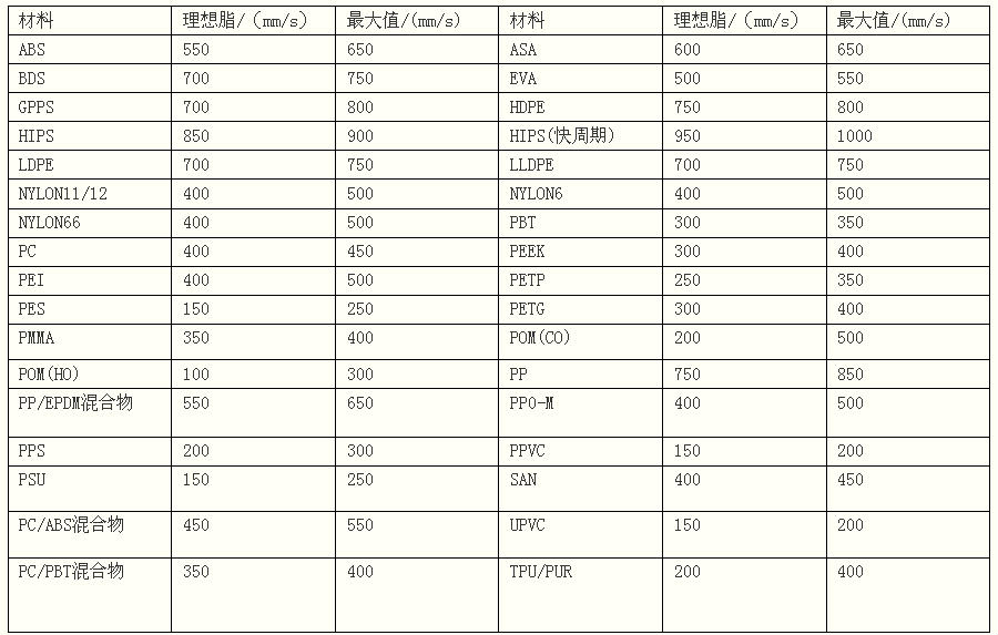 如何讓進(jìn)行螺桿速度設(shè)定??應(yīng)該是大家所關(guān)心的問題吧!現(xiàn)在我就來編輯一些專業(yè)化的數(shù)值表格,希望大家看完會(huì)對(duì)大家有所幫助!螺桿的表面速度(mm/s)=螺桿直徑(mm)x螺桿轉(zhuǎn)速x0.0524.現(xiàn)在我來說說典型的螺桿速度吧!如下圖:廣東深圳金鑫螺桿廠家是一家從事雙合金螺桿料管,注塑機(jī)螺桿,擠出機(jī)螺桿料筒,注塑機(jī)配件設(shè)計(jì),研發(fā),生產(chǎn),技術(shù)服務(wù),銷售之企業(yè). 電話:0755-27188830 27188831 金鑫螺桿權(quán)威官方網(wǎng)址http://www.hyvis.net 全國免費(fèi)技術(shù)服務(wù)熱線:400-082-2881.